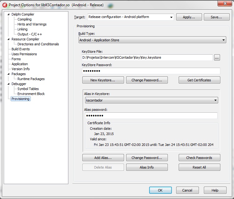 Provisioning: Project → Options → Provisioning Este passo é necessário, a fim de instalar o aplicativo em um dispositivo que tem a depuração USB desativada, será gerado um arquivo Key.keystore, que deve ser armazenado junto ao código-fonte