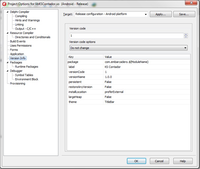 Versão: Project → Options → Version Info o Google Play exige que novas versões do seu aplicativo sempre tem um código de versão mais alto do que as versões anteriores.